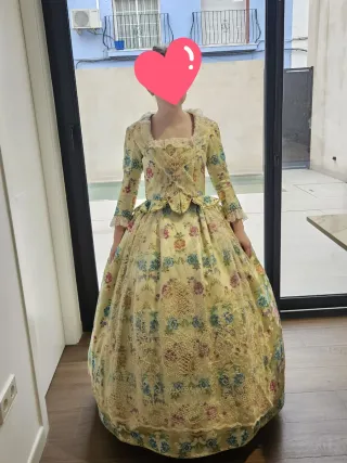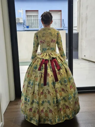 Traje de fallera, para niña de 12 a 14 años. La falda tiene unos 10-15 cm dentro para poder alargar. -Manteletas. -Otro floc para combinar (aparte del de la foto) -Zapatos forrados talla 35. -Tela para forrar mas zapatos. -Se incluye otro corpiño talla 14-16 igual que la falda.