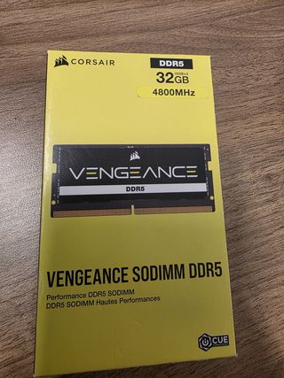 Vendo kit de memoria RAM para portátil de 32GB (2x16GB) de la marca Corsair, en perfecto estado de funcionamiento. 🔧 Especificaciones: Capacidad total: 32GB (2x16GB) Tipo de memoria: DDR5 SDRAM Formato: SO-DIMM (memoria para portátil) Velocidad: DDR5-4800 / PC5-38400 Frecuencia del módulo: 2400 MHz Marca: Corsair Chips de memoria: Micron (A-Die) ECC: No El kit ha sido completamente probado y funciona perfectamente, sin errores ni problemas de estabilidad. Ideal para actualizar portátiles, mejorar el rendimiento en multitarea, desarrollo, gaming o uso profesional.