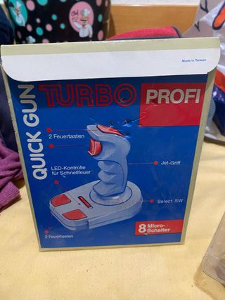 Joystick Quick Gun Turbo Profi. - Jet-Griff para un mejor agarre. - LED-Kontrolle para Schnellfeuer. - Select SW para selección. - 8 Micro-Schalter para funciones. - 2 Feuertasten en la base. - 2 Feuertasten en el mando.