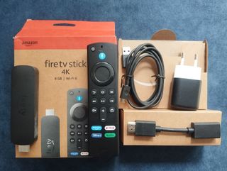 Fire TV Stick 4K de Amazon, compatible con Wi-Fi 6. Convierte tu TV en una Smart TV (Requisitos: Tener Wifi y Televisor con entrada HDMI), podrás ver en la TV aplicaciones como Netflix, DAZN, HBO, Disney+, Movistar+, Amazon Prime Video, etc (si pagas las suscripciones, lógicamente). Y otras como YouTube, RTVE Play, Pluto TV, Atresplayer, Mediaset Infinity, Agalega, etc (de manera gratuita y a la carta). Está en buen estado y funciona perfectamente. Se incluye todo lo que se ve en las fotos: mando a distancia, cable extensor HDMI., adaptador de corriente y cable USB. No se incluyen las pilas del mando.