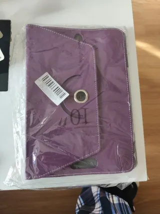 Funda protectora para tablet Android de 10.1 pulgadas. - Color púrpura. - Material tipo piel. - Costuras decorativas. Comprada por error y no se pudieron devolver por pasar el plazo de devolución. La ventaja que tiene está funda es que es estándar y se adapta bien a cualquier tipo de tablet