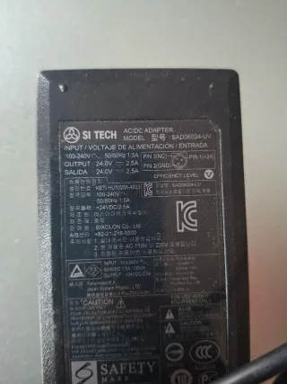 Adaptador de corriente SI TECH con salida de 24V y 2.5A. - Modelo: BA0600624-UV - Entrada: 100-240V ~ 1.5A 50/60Hz - Salida: 24.0V 2.5A - Conector de 3 pines