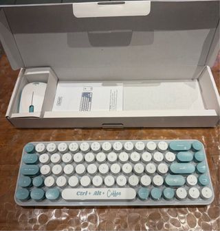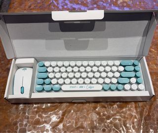 Conjunto de teclado y ratón inalámbricos con adaptador. - Diseño retro con teclas redondas. - Combinación de colores blanco y azul.