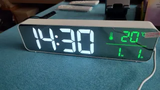 reloj despertador con pantalla LED de gran visibilidad. Su diseño minimalista se adapta a cualquier espacio. Mide 16 cm de largo, es grande. Funciona con cable USB, no es inalámbrico. Alarma con varios sonidos, posibilidad de 2 alarmas, indica hora, temperatura, día y mes. Solo encendido para comprobar que funciona y hacer las.fotos. - Pantalla con números grandes en blanco. - Indicador de temperatura ambiente. - Función de alarma.