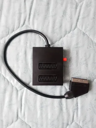 Adaptador de RCA o S-VHS a euroconector. Lleva un pequeño conmutador para seleccionar entre las 2 entradas posibles. Estado: nuevo y precintado.