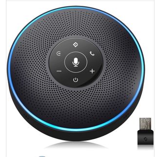 Altavoz portátil con micrófono integrado para realizar llamadas. - Diseño circular con acabado en negro. - Borde con iluminación LED azul. - Controles táctiles en la parte superior. - Incluye adaptador USB. - Caja sin abrir