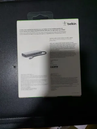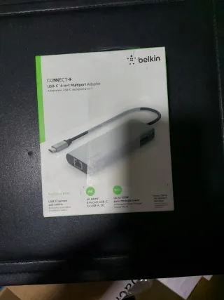 Adaptador multipuerto USB-C de Belkin con 6 conexiones. - 1x HDMI 4K - 1x Ethernet - 1x USB-C - 2x USB-A - 1x SD - Soporta hasta 100W de carga (alimentación passthrough).