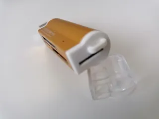 Adaptador lector de tarjetas con conexión USB. - Diseño compacto y ligero. - Carcasa metálica dorada.