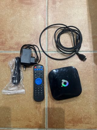 Dispositivo Android TV en color negro, con un diseño moderno y compacto. Incluye todos los accesorios necesarios para su funcionamiento. - Mando a distancia incluido. La patilla de la tapa declaz pilas rota. Pero funionando correctsmente - Adaptador de corriente. - Cable de conexión.
