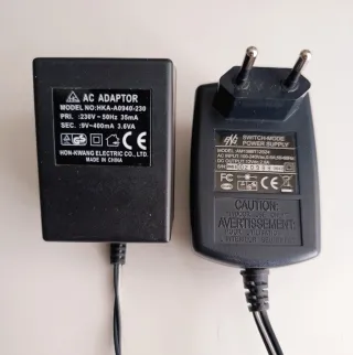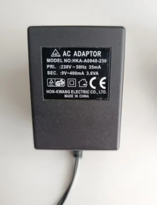 Se venden dos adaptadores de corriente AC/DC, uno de la marca HON-KWANG ELECTRIC CO., LTD. y otro de la marca ENG. - Adaptador HON-KWANG: Modelo HKA-A0940-230, entrada 230V~50Hz 35mA, salida 9V~400mA 3.6VA. - Adaptador ENG: Modelo AM138BT12S24, entrada 100-240Vac, 0.6A, 50-60Hz, salida 12Vdc, 2.0A. - Ambos son para uso en interiores.