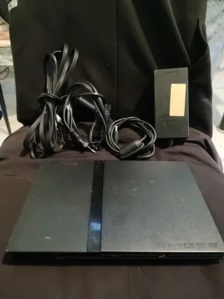Consola PlayStation 2 Slim en color negro Tiene roto lo que se ve en las fotos esquina un poco estillada y donde va la memory stik roto pero la memoria entra y hace su función perfecta todo funciona se da lo que se ve en las fotos - Incluye adaptador de corriente. - Cables de conexión.