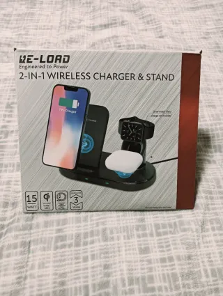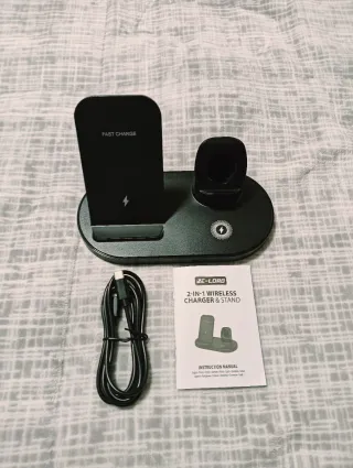 Base de carga inalámbrica 2 en 1 para móvil y smartwatch. - Carga rápida de hasta 15W. - Tecnología inalámbrica. - Accesorios un cable para la carga.