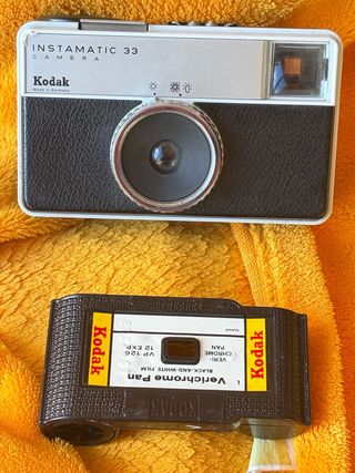 Cámara fotográfica Kodak Instamatic 33. Fueron de gran relevancia a nivel mundial, mas de 50 millones de diferentes modelos. - Modelo Instamatic 33. - Fabricada en Alemania. - Ajustes de exposición soleada/nublada y un “zapato caliente” para flash. Aunque se fabricó en Alemania también en Reino Unido y Brasil. - Ésta fue producida entre 1968-1973, tipo película cartucho de 126, que se acompaña con la cámara.