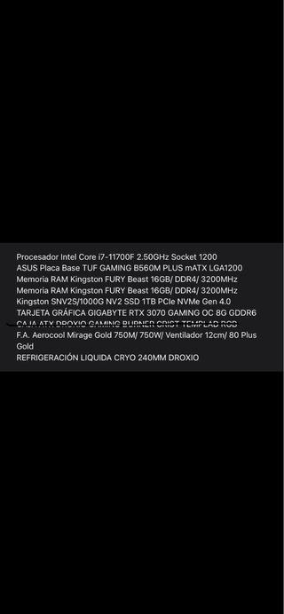 PC gaming muy bien cuidado, se ha usado poco y para gaming prácticamente nada, por lo que desgaste mínimo. Windows 10 Pro instalado para actualizar a Windows 11 en cualquier momento. La caja es una Mars Gaming de gama superior a la que aparece en la descripción. Monitor no incluido. 100€ MSI curvo 27” 1080p 144Hz 1ms Segundo monitor. 50€ Philips 23” LED IPS Regalo teclado (Corsair K55 RGB valorado en 50€) si lo necesitas. Regalo pincho WIFI, adaptador Bluetooth y base con ruedas para fácil movilidad y evitar polvo a ras de suelo. - Panel lateral de cristal templado. - Frontal con diseño de malla para ventilación.
