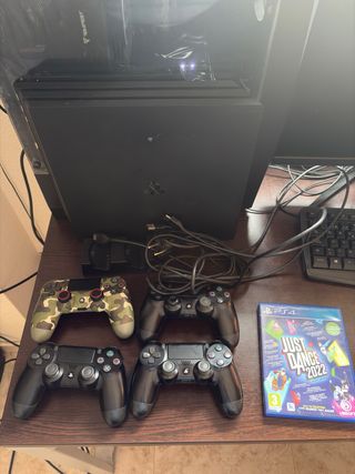 Consola PlayStation 4 Pro en color negro, junto con cuatro mandos DualShock 4 y el juego Just Dance 2022. - Incluye consola PS4 Pro. - Cuatro mandos originales. - Juego Just Dance 2022 para PS4. -Consola en buen estado -Precio negociable -Entrego tambien Call of Duty MW2 en fisico y actualizacion gratis para ps5 -Puedo hacer pack con alguna tele y dejarlo mas barato -Preguntad todo lo que querais