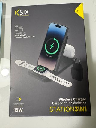 Estación de carga inalámbrica Ksix 3 en 1. - Compatible con Apple Watch, Lightning Apple Airpods y iPhone. - Carga rápida de 15W. - Diseño moderno y compacto.