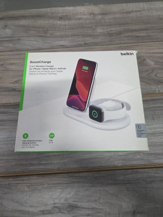 Cargador inalámbrico Belkin BoostCharge 3 en 1 para iPhone, Apple Watch y AirPods. Solución de carga integrada. - Carga 3 dispositivos simultáneamente. - Compatible con iPhone, Apple Watch y AirPods. - Potencia de 7.5W.