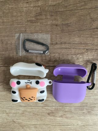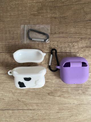 Set de fundas para Airpods 4 con un diseño divertido. - Funda con forma de vaca. - Funda morada. - Incluye mosquetón.