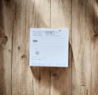 Estación de carga con un diseño elegante en estilo madera y blanco, ideal para tus dispositivos Apple. - carga Iphone con Magsafe - carga Iwatch y airpods - incluido cable usb c y power supply No tengo Airpods, asi que no he probado si se carga o no.