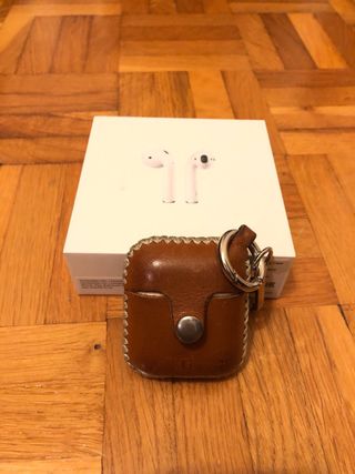 AirPods de 1ª generacion con caja original y funda de polipiel con gancho de muelle. Están en muy buen estado. Los auriculares se cambiaron en 2021 durante una campaña de Apple para reemplazo de baterías. La batería del estuche es la original y va durando pocas cargas ya.