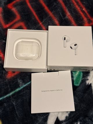 Auriculares inalámbricos Apple AirPods de 3ª generación. Comprados en MediaMarkt. Tienen uso pero funcionan a la perfección. Se entregan en su caja con lo que venian. Se venden por que me han regalado los nuevos. - Diseño ergonómico. - Estuche de carga.