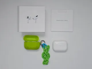 AirPods Pro de primera generación. - Funda protectora adicional de color verde brillante. - Llavero decorativo con cadena de eslabones verdes y azules.