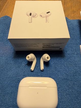 Auriculares inalámbricos Apple AirPods Pro de primera generación. Cuentan con tecnología de cancelación de ruido para una experiencia de audio inmersiva. - Diseño ergonómico para un ajuste cómodo. - Estuche de carga compacto. - Caja original. - Todas las almohadillas, varias de ellas sin estrenar. - Cable de carga sin estrenar.