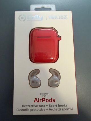 Funda protectora Celly AirCase para AirPods en color rojo. Incluye ganchos deportivos para un mejor ajuste. - Diseñada para AirPods. - Incluye funda protectora y ganchos deportivos.