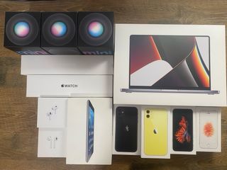 Cajas vacias de productos de Apple. Todas vienen con su contenido original, excepto dispositivos (instrucciones, pegatinas). Incluye: - Macbook Pro M1 Max 14" 32 GB. - iPhone 11, negro, 64 GB. - iPhone 11, amarillo, 64 GB. - iPhone 6s, gris espacial, 16 GB. - iPhone SE, rosa dorado, 16 GB. - Airpods Pro 2. - Airpods 2. - Apple Watch series 1, 42 mm, Azul dorado. - Apple Watch SE, gris espacial, 44 mm. - iPad mini, 16 GB, gris espacial. - 3 Home Pod mini negro.