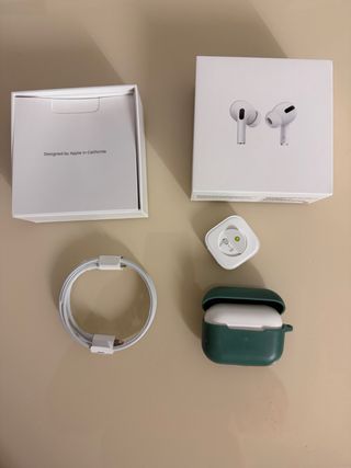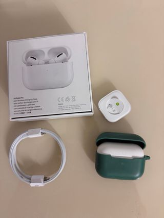 Auriculares inalámbricos Apple AirPods Pro. - Incluye estuche de carga. - Funda protectora de silicona verde. - Cable de carga USB-C a Lightning.