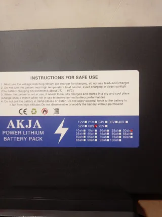 Batería de litio AKJA de 60V y 30Ah. - Voltaje: 60V - Capacidad: 30Ah - Tipo: Batería de litio - Incluye instrucciones de uso seguro.