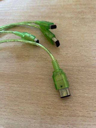 Cable de conexión para Game Boy, ideal para intercambiar Pokémon entre consolas. - Color verde translúcido. - Conexión para dos Game Boy. - Incluye adaptador.