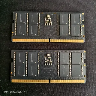Se venden dos módulos de memoria RAM DDR5 SODIMM de 32GB cada uno, para portátiles o mini PCs. - Capacidad total: 64GB (2x32GB) - Velocidad: 5600MT/s - Latencia: CL46 - Voltaje: 1.1V - Modelo: TC22G81E - Número de serie (módulo 1): 3925040B - Número de serie (módulo 2): 392503E1