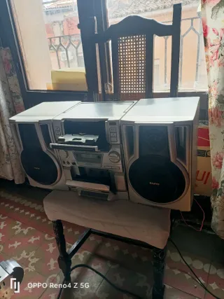 Radio cassette Sanyo en color plata y negro. - Diseño compacto y funcional. - Altavoces integrados.