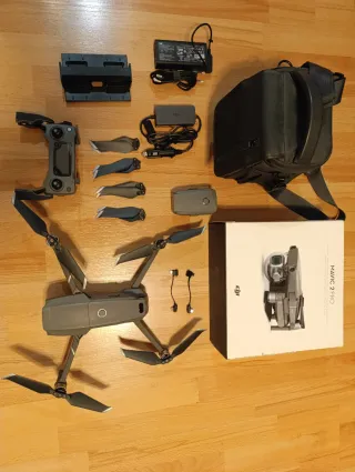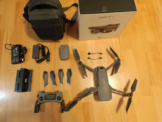 Drone DJI Mavic 2 Pro en color gris y negro. Incluye todos los accesorios necesarios para su uso. - Mando a distancia. - 2 Baterías. - Cargador de pared para 4 baterías y de coche. - Juego de hélices de repuesto. - Bolsa de transporte. - Caja original.