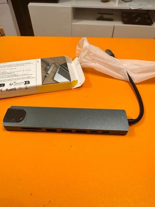 Adaptador USB-C multifunción en color gris plateado. Permite conectar varios dispositivos a tu ordenador. - Salida HDMI 4K UHD. - Puerto Ethernet RJ45. - Lector de tarjetas SD/TF. - Puertos USB 3.0 (SS). - Puerto de carga USB-C.