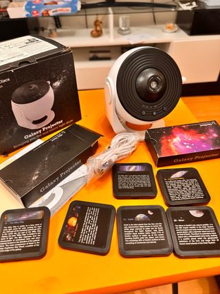 Proyector de estrellas y galaxias, ideal para crear un ambiente único. Incluye 12 discos diferentes para proyectar. - Modelo: Galaxy Projector. - Incluye 12 discos temáticos. - Diseño moderno en blanco y negro.