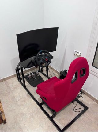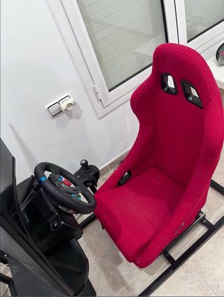 Estructura completa para simulador de conducción con asiento baquet. - Estructura metálica resistente hecha a medida con base para el volante y la TV, tambien dispone de soprte para cambio de marchas manual. - Asiento baquet de color rojo con guias para regular la distancia, ergonómico y muy cómodo para sesiones largas de juego. -⚠️ IMPORTANTE: El anuncio es SÓLO por el cockpit (asiento + estructura). El volante y los pedales que se ven en la foto SE VENDE APARTE.(Logitech G29) -Muy cuidado, sin holguras ni desperfectos en la tela del asiento. Perfecto para montar y disfrutar.