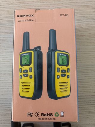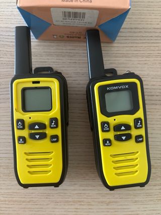 Par de walkie talkies KOMVOX GT-60 en color amarillo y negro. Ideales para comunicación a corta distancia. - Diseño compacto y ergonómico. - Pantalla digital. - Botones de función y menú.