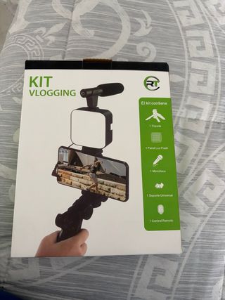 Kit completo para vlogging de la marca RT. Ideal para crear contenido de video de alta calidad. - 1 Trípode - 1 Panel de Luz Flash - 1 Micrófono - 1 Soporte Universal - 1 Control Remoto