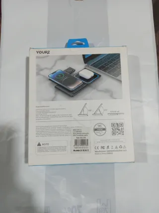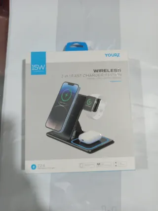 Cargador inalámbrico 3 en 1 de la marca YOURZ. Permite cargar varios dispositivos a la vez. - Carga rápida de 15W. - Compatible con teléfonos, Apple Watch y auriculares. - Diseño moderno y compacto.