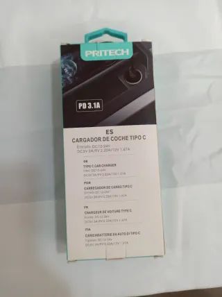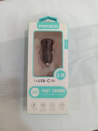Cargador de coche PRITECH con puerto USB tipo C. - Carga rápida de 3.1A. - Protección contra sobrecarga. - Protección contra cortocircuitos. - Potencia máxima de 20W.