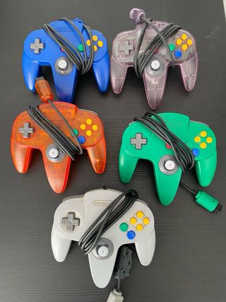 Consola Nintendo 64 con accesorios y juegos. cables originles adaptador TV moderna - Incluye 5 mandos. el verde el joystik no funciona bien. - Contiene 7 juegos: Mario Tennis, The Legend of Zelda: Majora's Mask, Super Mario 64, Summer Games, Mario Kart 64, Re-Volt Mario Party 3.