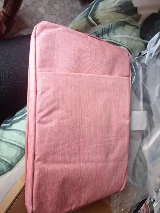 Funda para portátil de color rosa. Fabricada en un material textil con un diseño moderno. - Compartimento principal. - Bolsillo frontal. La he abierto para tomar la foto. Está nueva a estrenar.
