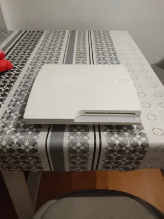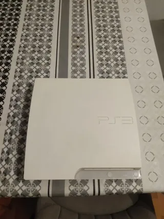 Consola de videojuegos PlayStation 3 en color blanco. - Diseño elegante y moderno. - Entrada frontal para discos. - Botones de encendido y expulsión accesibles.