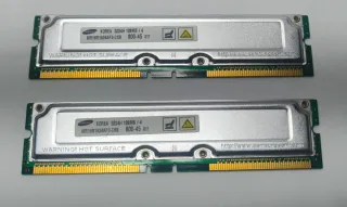 Dos módulos de memoria RIM (RAM BUS) Samsung de 128MB cada uno. - Modelo: MR16R1624AF0-CK8 - Fabricado en Corea. - Capacidad: 128MB por módulo.