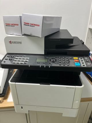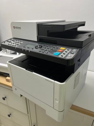 Impresora multifunción Kyocera ECOSYS M2135dn en color blanco y negro. Imprime con rayas verticales por eso la hemos cambiado, posiblemente tenga arreglo cambiando alguna pieza o mantenimiento. - Escáner - Copiadora - Fax - Impresora