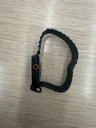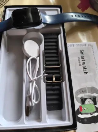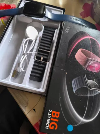 Reloj inteligente con pantalla grande y diseño moderno. Incluye cargador. - Pantalla de 2.19 pulgadas. - Correa de tela negra. - Correa adicional azul.