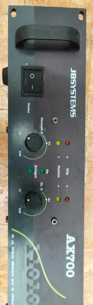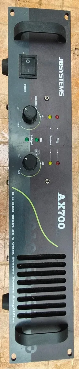 Amplificador de audio JBSYSTEMS AX700 en color negro. Potencia de 2 x 350 vatios a 4 ohmios. No probado . Para reparar o repuestos . Sin devolución. - Control de volumen para Canal A y Canal B. - Indicadores LED de On, Protect y Clip. - Selector Bridged para modo puenteado. - Entrada de audio para Canal A y Canal B.
