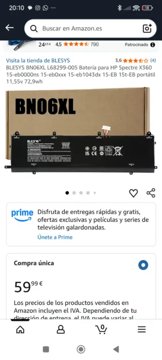 Batería recargable de Li-ion modelo BN06XL. - Voltaje: 11.55V - Capacidad: 6312mAh / 72.9Wh - Fabricada en China por Dongguan Lewe Electronics Co., Ltd. - Advertencia: No desarmar, aplastar, perforar, cortocircuitar o desechar en fuego o agua.